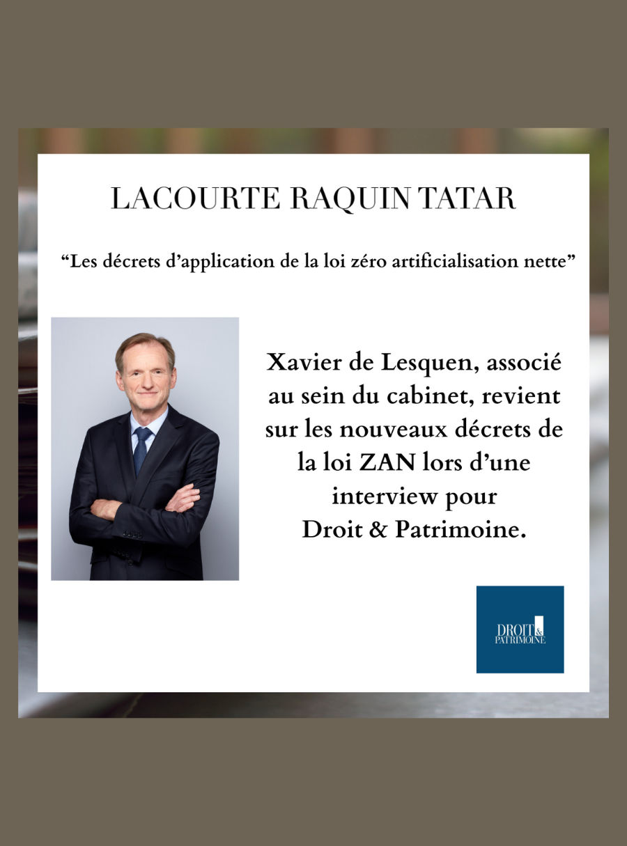 In an interview with DROIT&PATRIMOINE magazine, Xavier de Lesquen, partner at Lacourte Raquin Tatar, looks back at the three new decrees published on 28 November 2023 relating to the “Zero Net Artificialisation” law.